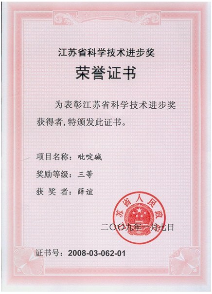 公司主持參與了《工業(yè)用吡啶》、《工業(yè)用3-甲基吡啶》國家標(biāo)準(zhǔn)的制定,主持了《工業(yè)用哌啶》、《工業(yè)用4-甲基吡啶》、《工業(yè)用2-甲基吡啶》等5項(xiàng)行業(yè)標(biāo)準(zhǔn)的制定。此外,公司已經(jīng)建立成熟的質(zhì)量體系,來保障產(chǎn)品質(zhì)量達(dá)標(biāo),并榮獲江蘇工業(yè)質(zhì)量標(biāo)桿企業(yè)、江蘇省質(zhì)量信用AA級(jí)企業(yè)等多項(xiàng)質(zhì)量榮譽(yù)。